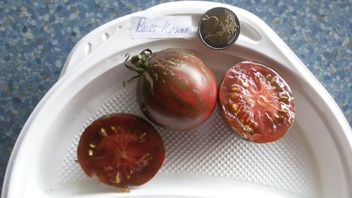Mittelgroße Tomate ´Russischer Kosar´ rotviolett braungrün gestreift ca. 100 cm    Status    k.A.
